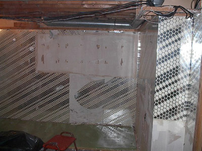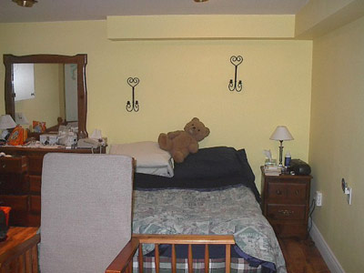 December 3, 2003. This is what used to be Nic's drum room and is now our bedroom. The picture was taken after my dad & his brother ripped out the closet wall and the funky marbleized mirror tiles. In case you never visited the basement in all its glory, this is the famous reflective hexagonal wallpaper (the orange shag carpeting was long gone by this stage of construction). I also enjoy the exposed roof & ducts; it's all very Brazil. This is what that corner looks like now. I thought I'd take a picture in case the bed is never made again. That's my teddybear, Lilith. Yes, I sleep with her every night. No, I'm not ashamed in the least. Note our ugly, ugly comforter - it started out life in a "bed in a bag" package won at a golf tournament, and quickly became a mainstay of our life when we discovered that it's the only comforter we own that fits the bed. Such luxuries as an attractive comforter cover will have to wait until a much more affluent day. It's the Sprout corner! Just looking at it makes me happy (although it'd be happier with the Sprout inside, of that you can be sure). Almost everything you see is a gift or a hand-me-down: the watercolour was painted by Javina's mother, the lamp came from my flower child's family, the dresser is of mysterious origins and may have been my mother's, the alphabet tapestry was a gift from Poet & Marcie, and the mobile was picked up in a Chicago swap shop last summer. Even the baby grooming stuff on the dresser were all shower gifts (the cotton balls were an anniversary present from Palaver). The only new item is the Ikea crib & all of its green & white accessories. A good deal of my happiness comes from the extreme generosity of my friends, family & coworkers. But I'd still like to put a red-faced, wiggling baby in that scene. The baby bookshelf, also of mysterious origins & full of books & toys & clothes that need to be washed. Both the bookshelf and the dresser were painted in white & finished with yellow paint leftover from the walls. It has a custardy effect that's pretty pleasant. And no, I didn't decorate in yellow because I don't know the Sprout's gender. I just like yellow, okay? The cradle came from my zia as a temporary roosting place for the newborn. One day a big white wardrobe will live in that space. In the meantime, it holds a few baby outfits from Aunt Scout, Mrs. Sommers & Fairy GothMother Stacy. Meow! If you look on the second shelf, you can see Sprout's first present: a Borg bear from Palaver, purchased at Convergence 9 before he even knew that I was pregnant. It's spookily cute. Like me. Just for contrast, this is what the rest of our love nest looks like. You can peek through the door to the serenity of the bedroom...but out here chaos reigns supreme. { b a c k } |